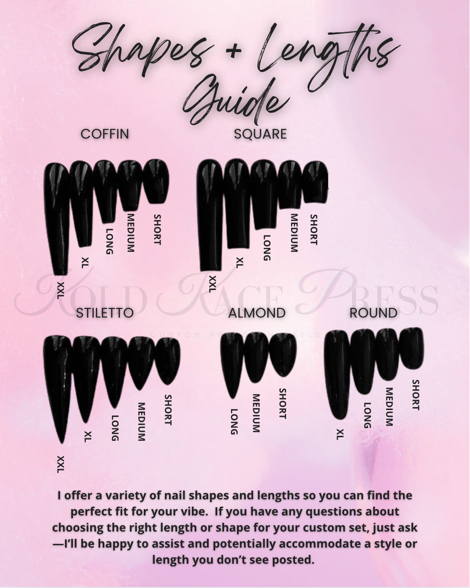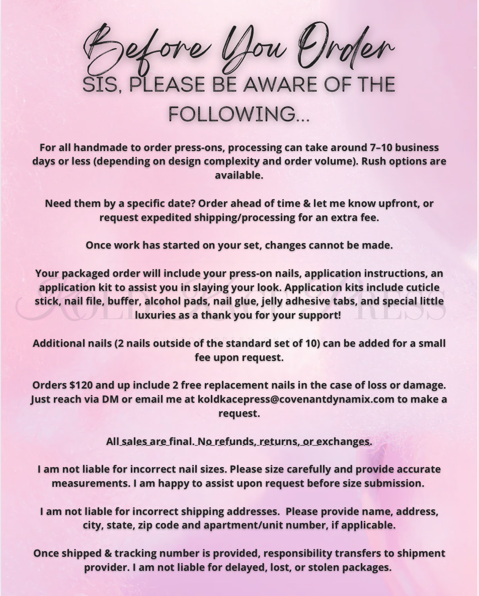 Each set comes with application instructions and an application kit (Nail glue, jelly adhesive tabs, file, buffer, alcohol wipes, and cuticle stick) to make applying your nails easy and seamless. Your order may also include some complimentary goodies!